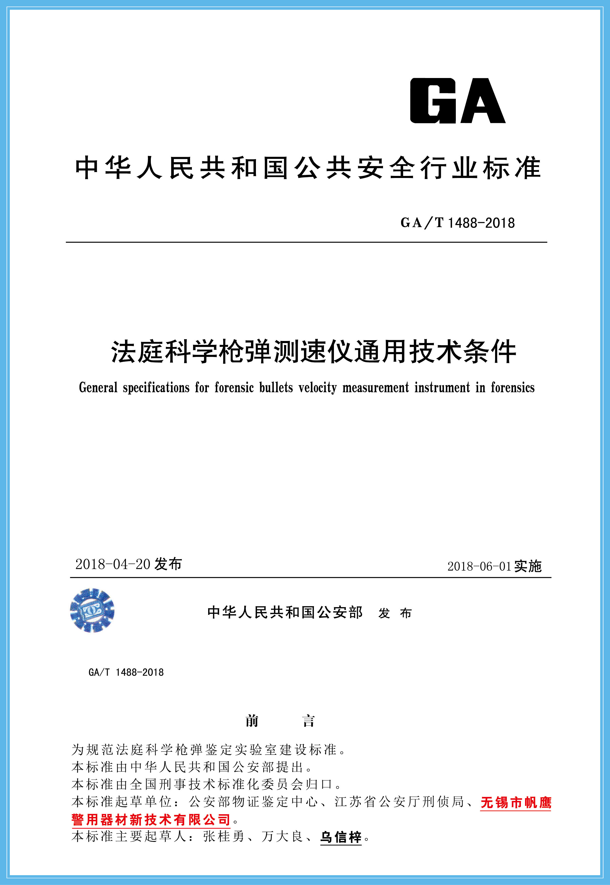 無錫市帆鷹警用器材新技術(shù)有限公司起草了11項行業(yè)標(biāo)準(zhǔn),目前公安部已審核通過10項,此次通過的3項為2018年度公安部新列標(biāo)準(zhǔn),已報國家質(zhì)量監(jiān)督檢驗檢疫總局備案,通過的3項標(biāo)準(zhǔn)為:法醫(yī)科學(xué)槍彈測速儀通用技術(shù)條件(GA/T 1488-2018)、法醫(yī)電動開顱鋸?fù)ㄓ眉夹g(shù)條件(GA/T 1489-2018)、法醫(yī)科學(xué)危險槍支射擊架通用技術(shù)條件,現(xiàn)特予以公告。